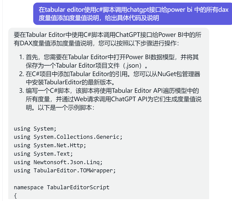 然而,chatgpt给我的这个库并没有连接本地文件的这个功能,那只能通过其他方法了,在之前有写过PowerBI使用Tabular Editor翻译报表模型,当然也可以调用接口来添加度量说明吧,还是直接问chatgpt吧